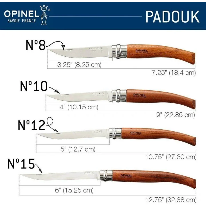 Opinel noževi sa slim oštricom rade se u sljedećim varijantama (brojevi označavaju koliko je oštrica dugačka):