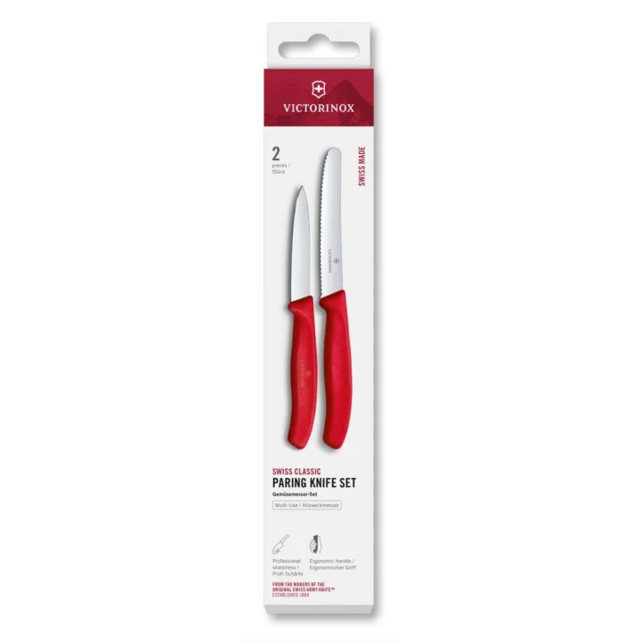 Victorinox set kuhinjskih nožića crvene boje drške, a sastoji se od malog ravnog paring nožića oštrice dužine 8cm i noža za rajčice i pizzu nazubljene oštrice od 11cm i oblog vrha.