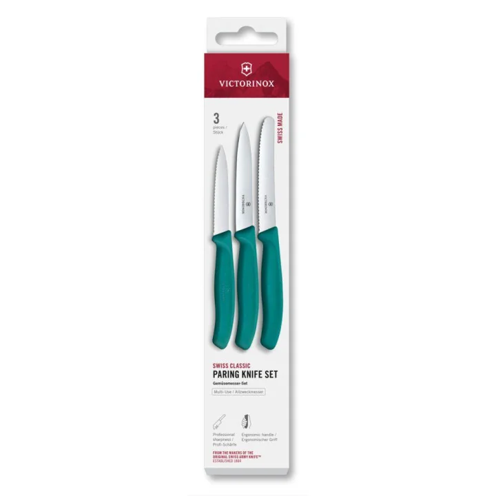 Victorinox set kuhinjskih nožića zelene boje drške, a sastoji se od malog nazubljenog paring nožića oštrice dužine 8cm, većeg paring nožića ravne oštrice dužine 10cm i noža za rajčice i pizzu nazubljene oštrice od 11cm i oblog vrha.