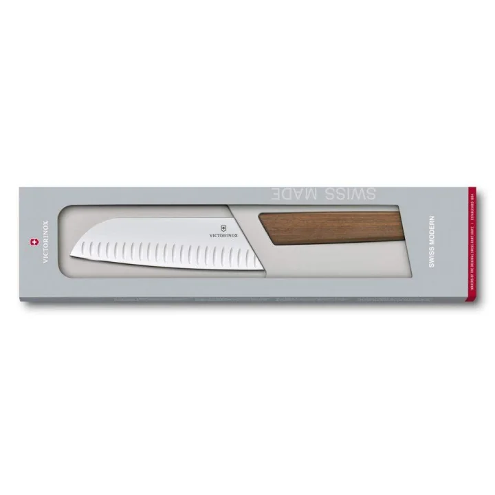 Swiss Modern Santoku nož sa drvenom drškom od oraha, pakiran u poklon kutiju.