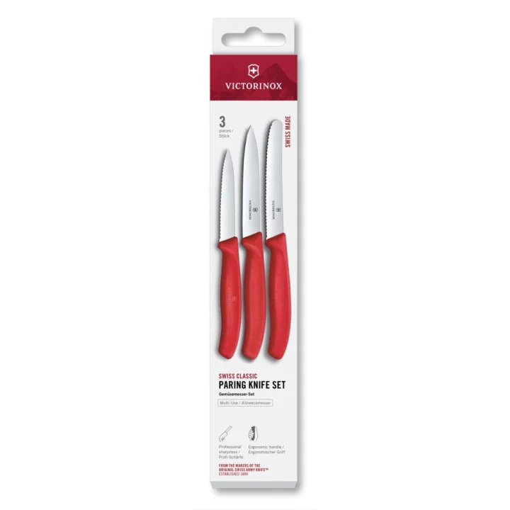 Victorinox set kuhinjskih nožića crvene boje drške, a sastoji se od malog nazubljenog paring nožića oštrice dužine 8cm, većeg paring nožića ravne oštrice dužine 10cm i noža za rajčice i pizzu nazubljene oštrice od 11cm i oblog vrha.